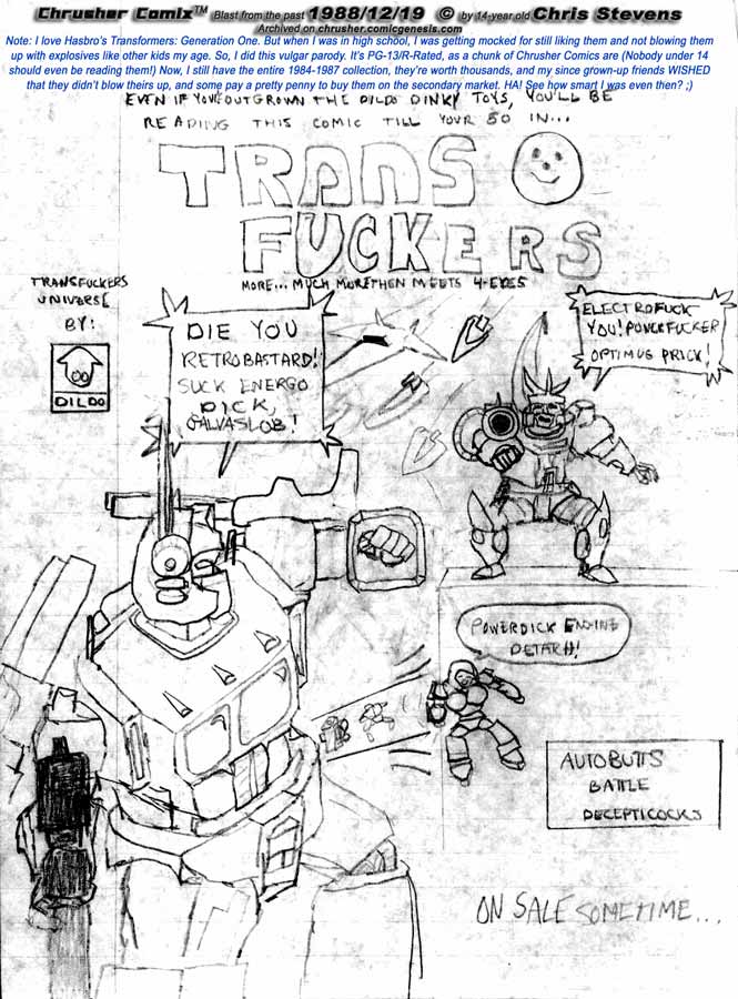 So flashback to 1988. I was the kid who still liked Transformers. I was still quoting the cartoons and had all the toys on my shelf. Most of my friends and classmates thought I was immature and needed to grow up because I still liked toys. They either blew theirs up with firecrackers and threw them away or their parents gave them away. But I kept all mine. (In hindsight, who was more mature? See the secondary market prices?) Now, it's a different answer as all the toys are worth a lot of money and the cartoons are beloved. Back then, my way of dealing with it was to try and "spice them up". I bragged about TF:TM had swear words and characters actually died! And.. when I was 14, I drew comics where I used adult vulgarity to try and sell to my buddies that TFs were still cool. And this is what that was. I was doing "Adult Swim" and "Family Guy" type of stuff back before it existed. Probably why I am a tad jaded and jealous that people made money and fame doing this sort of thing, and I didn't.