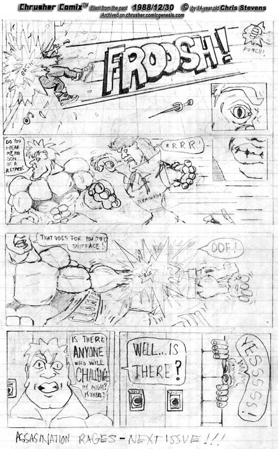 Obliterator has grown too strong, too angry, too tough for Chrusher and Terminator to repeat their double-team win. HuMiracle Grow has increased his muscle mass beyond human levels, along with his his fast-twitch muscle fiber response, his hand-to-eye coordination. It looks bleak for our Conqueror Vigilante group. Unless... Original Pencil Layouts: Finished version.Original version (Pencil on lined school paper 1988).