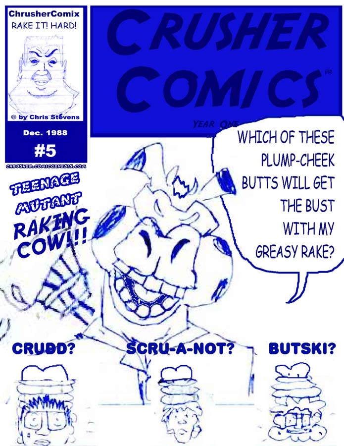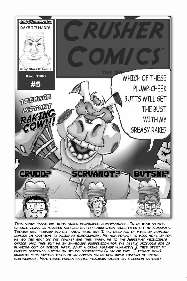 "Chrusher" must face the crazed student known as Scott "The Cow" - and the madness of his lethal rakes. Yes, I said rakes. But Cow is not the only foe that is lurking... a powerful enemy with an insatiable desire for inflicting pain is waiting in the wings for violent revenge! A digitally re-mastered collection of the "Chris' Crusher Comics" Mini-Issues #4-6 from 1988 printed for the very first time! It is the year 1988, and a heroic young lad nicknamed "Chrusher" must face friends, foes, nerds, misfits, bullies, people of alternate lifestyle choices, and corrupt faculty members in his quest for normalcy and justice in a small but strange high school. That, um, will not happen in this book. This story is ****ed. (Please advise, this comic is suitable only for 14-and-up. I'd say higher, but a 14-year-old wrote and drew it).