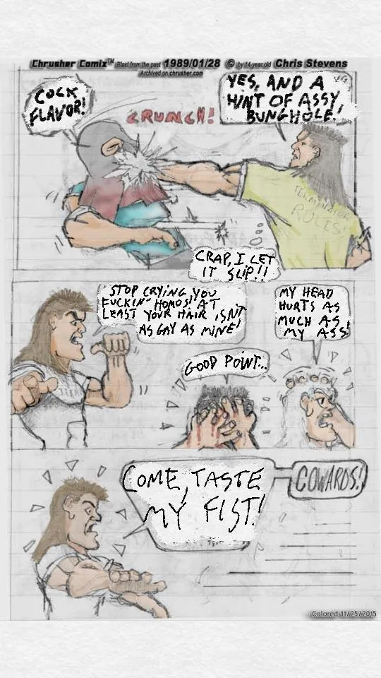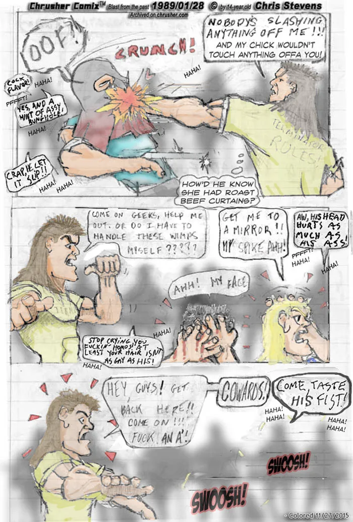 It all began 27 years ago with this pencil on lined paper comic page by 14-year-old me. The original version from sometime during the winter of 1988-89: Pretty mundane and simple, nothing stands out, but it's moving the story along. Well, now you are in for a special treat! In the middle of the 25th-Anniversary coloration/re-masteration of this page, occasional fan / friend / traitor / contributor RaYzor "Special" C. was asked if he had any ideas on a "George Lucas Special Editioned" of this very page. He got back to me with his mad LEET MS Surface sKILLz. In other words, he tried really hard to MST/Rifftrac it. Before RaYzor's input: After RaYzor' input: While Mr. Zor's new captions were indeed humorous, he ignored all character traits and seemingly turned the characters gay, and violently so (he must be watching too many TV shows and movies nowadays where more people are gay than straight). While the captions are funny, I couldn't include them without completely destroying the characters and the story. Aaron 'Terminator' Terrorzulli is a cocky, tough, pretty boy with muscles who would just as soon punch someone acting gay towards him than actually be gay (and while that may offend someone who didn't know any better, it was typical of what a cocky straight 14-year-old in 1988 would do). Now while Keith 'Slasher' Klarkson is a loose-cannon character that would say or do anything, and Chrusher didn't change much, Chris 'Crasher' Chassis also suddenly went all gay (or gay raped?) as well. At the end, what was Ray going for? Ray's a pretty big Mystery Science Theatre fan. He was MST/Rifftracking it. Well, then it all clicked. The students in the background (they are fighting in a classroom and the students think it's some impromptu play by glee club or something) now do what any group of teenagers would do. Mock stuff! And very harshly at times! Problem solved! Viola! So the page now is a little busy... BUT... in my opinion it is considerably funnier than it had been for 27 years. Albeit LESS politically correct now than then! Enfvckigjoy!"Nobody's slashing anything off me!" (BLACK AND WHITE EDITION!)