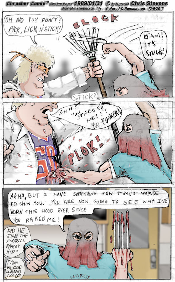 "You are now going to see why I've worn this hood ever since you raked me!"