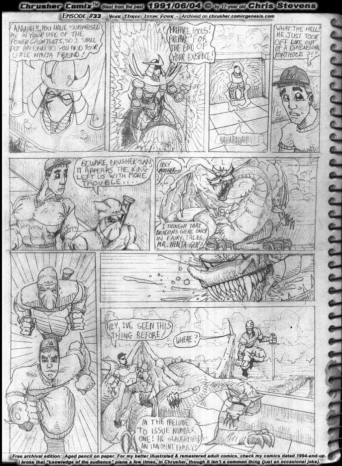 This comic really took some strange turns in Year Three. Chrusher was facing some strangely powerful villains -- hell, before he just faced fellow classmates. What were these powerful energy gauntlets? Who is the armored King Babah? Did he just teleport somewhere? Is this dragon creature real or an illusion? Part of it is requests by classmate/reader/fans of the book and art projects. Part of it is having a loose plan (that I retcon as I go back and remember loose strings I left!). Part of it was it was the end of the 1991 school year and I needed to wrap things up for the following season, but part of it was just 17-year-old me thinking the shit looked f'n' cool when it came down to it. Personally, I didn't care for my dragon... he was kind of a request and he didn't come out as well as I wanted... AND it made no goddamn sense! lol! (C) 1991-2021 Christopher Galletta Stevens. All Rights Reserved. Use ONLY with permission, links and credit.