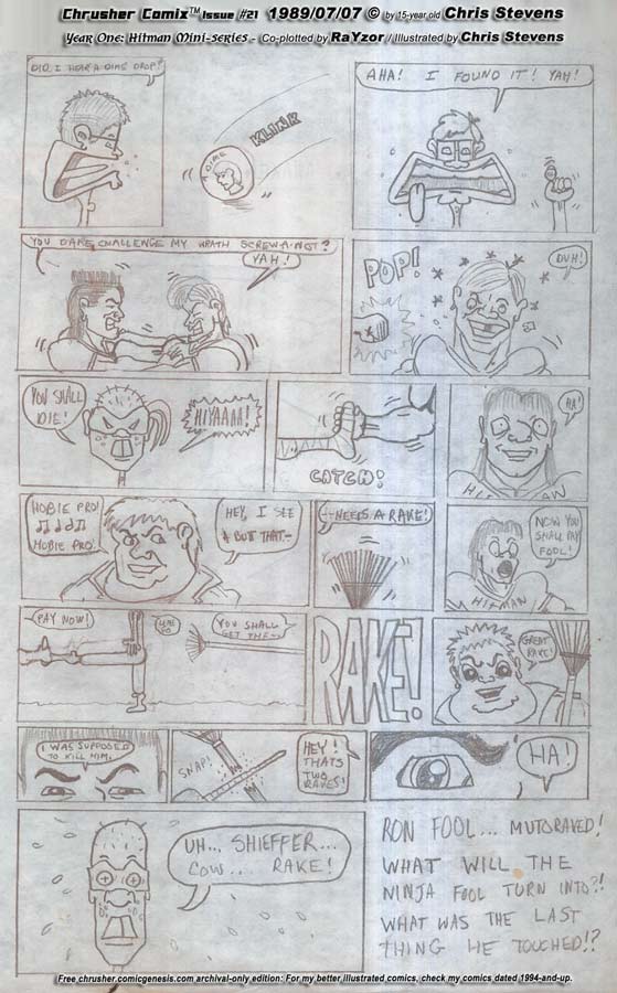 "I see a butt that needs a rake!" - Scott "The Cow" Gagnon As Butski scrounges a dropped dime, the high scholars tussle for supremacy, Scott desires to rake their asses. (C) 1989 by Christopher Galletta Stevens