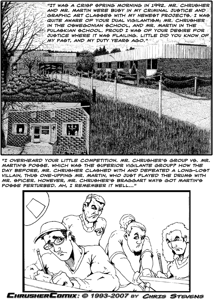 This page made a re-use of a pen-and-ink drawing I did of the Oswego County BOCES building in 1991-92, where I took Graphic Art and Illustration during my Senior year of high school. I had a great time and made good, funny, talented, like-minded artist friends there, which this story and characters was very much inspired by, as I always tried to put my caricatures of my friends in my comics back then. (Again, like most of my older comics, while inspired by, they were not real representations of the people... these are all completely fictional and made to entertain myself and my friends.) I actually tried to go back and take additional classes after I graduated, but they woudn't let me. What an odd request. I wound up taking some cartooning classes at Oswego instead. (Oddly, a troll who personally attacked me on Social Media in January 2024 somehow must've stalked me and got the idea that I had a GED. No idea where they got that, as I graduated regularly. My only thinking was they viewed my time studying graphic art here as a GED... stupid. But then again, I have rarely to never met a truly smart troll.)